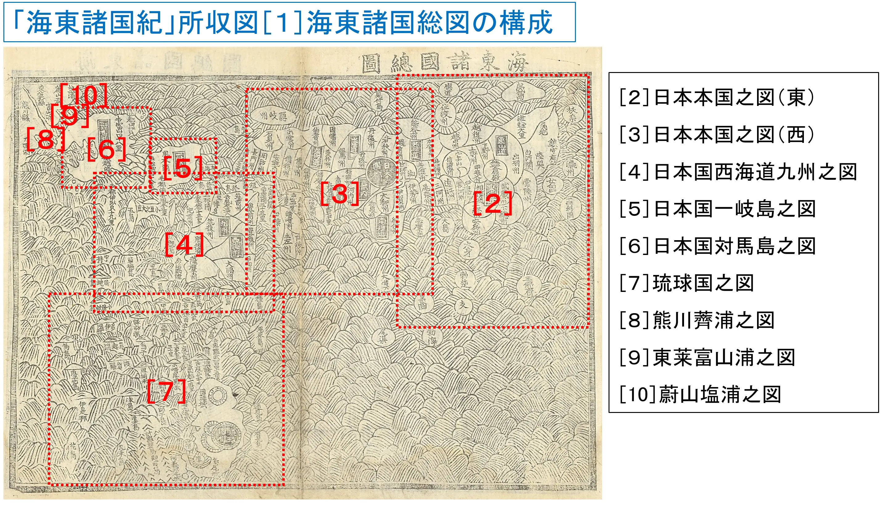 所収図は全 10 点あり、いずれも古い東アジア図・日本国図・琉球国図として、地図史上の意義が高いものになります。冒頭の「海東諸国総図」で、以下9点の絵図を合成して一図に仕立てたものです。このうち、日本部分は中世の日本図として一般的だった行基図様式をベースにしています。また、九州・琉球部分は 1453 年に博多商人道安から朝鮮王朝に献上された絵図をベースにしていると考えられています。朝鮮と関係の深い対馬・壱岐は大きく描かれて両島図が別立てにされるとともに、倭人(日本人)の居住が許可されていた朝鮮三浦(さんぽ)の薺浦(乃而浦)・富山浦・塩浦の図も採録されるなど、15世紀の絵図史料として貴重な情報が多く含まれています。